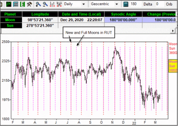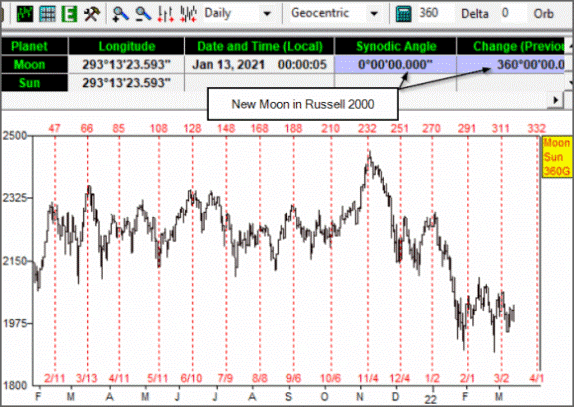 The 2/8/2022 post showed the New Moon in the SP500 covering a 6 month period. We now expand that to one year in the Russell 2000. This index is good to demonstrate lunar cycles due to its sideways choppy action. An index showing a strong directional trend (such as the SP500) will overwhelm the smaller cycles.