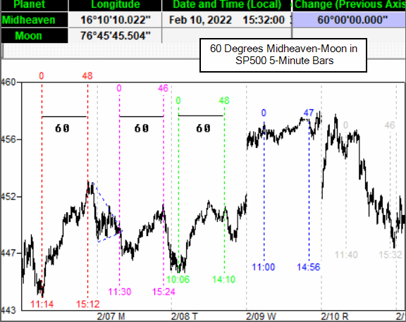The 2/8 post used the New Moon (Sun-Moon conjunction) to time the SPX on daily charts. The Moon is also used for intraday timing. This chart shows 5 days of the SPY last week using 5 minute bars. Because the Earth rotates one degree in about 4 minutes you can use 4 minutes bars for more precision.