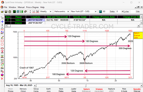 Since Cowan published his first book, Four-Dimensional Stock Market Structures and Cycles, in 1993, he has emphasized the synchronicity that exists between stock market cycles and the heliocentric Saturn-Uranus cycle. This cycle has continued to provide accurate market timing for more than 30 years since that publication.