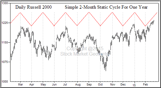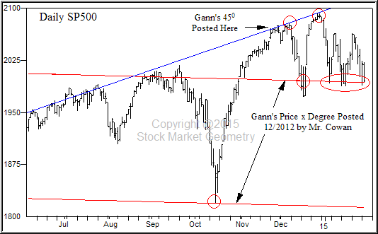 The efficacy of Gann’s “Price by Degree” in timing the SP500 has been well documented over the past year in the below posts. This same tool also timed the 4/27/2015 top in the Russell 2000. Since October 2014 the Russell had been following a linear trend until running into the Price x Degree. This top also coincided with the cycle shown below in the 2/25 post.