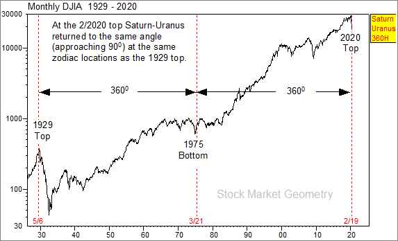 Based on page 55 of Cowan’s Pentagonal Time Cycle Theory. Cowan showed that Saturn-Uranus cycles repeat in the same zodiacal locations (plus one 30 degree sign) every 90 years. These first order recurrences marked the 1929 and 2020 tops. Saturn-Uranus cycles repeat on the opposite side of the zodiac every 45 years. These second order recurrences, same angle opposite zodiac location, marked the 1975 bottom.