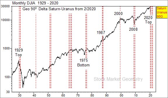 The Geocentric perspective below shows Saturn-Uranus approaching the ominous 90 degree angles at the 1929-1930 and 2020 tops. This chart measures Saturn-Uranus delta 90 from the 2020 top. This includes conjunctions and oppositions. Every recurrence for the past 100 years was significant, and lasted much longer than expected.