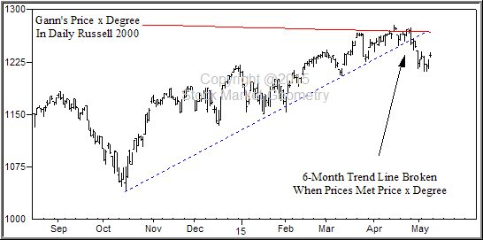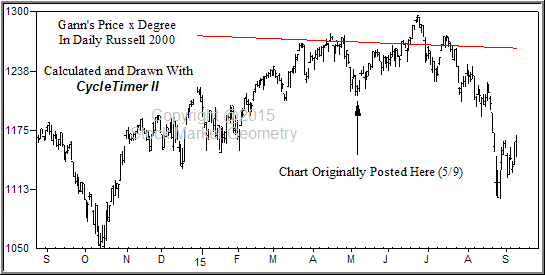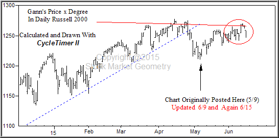 One month ago we posted a chart of the Russell 2000 with Gann’s Price by Degree. Since then, prices advanced back up to exactly touch that line and retreated. (Since 6/9 prices have again bounced off the Price x Degree).