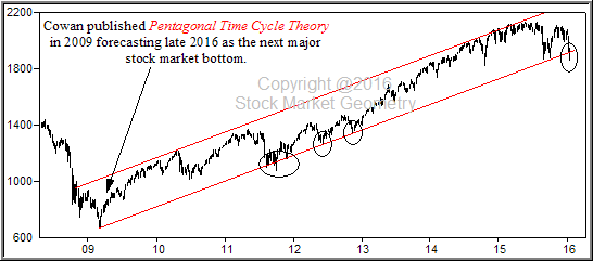 Bradley F. Cowan published Pentagonal Time Cycle Theory in 2009 where he forecast late 2016 as a major stock market bottom. His based this forecast on the pentagonal subdivision of the 84-year cycle into five smaller 17-year cycles.
